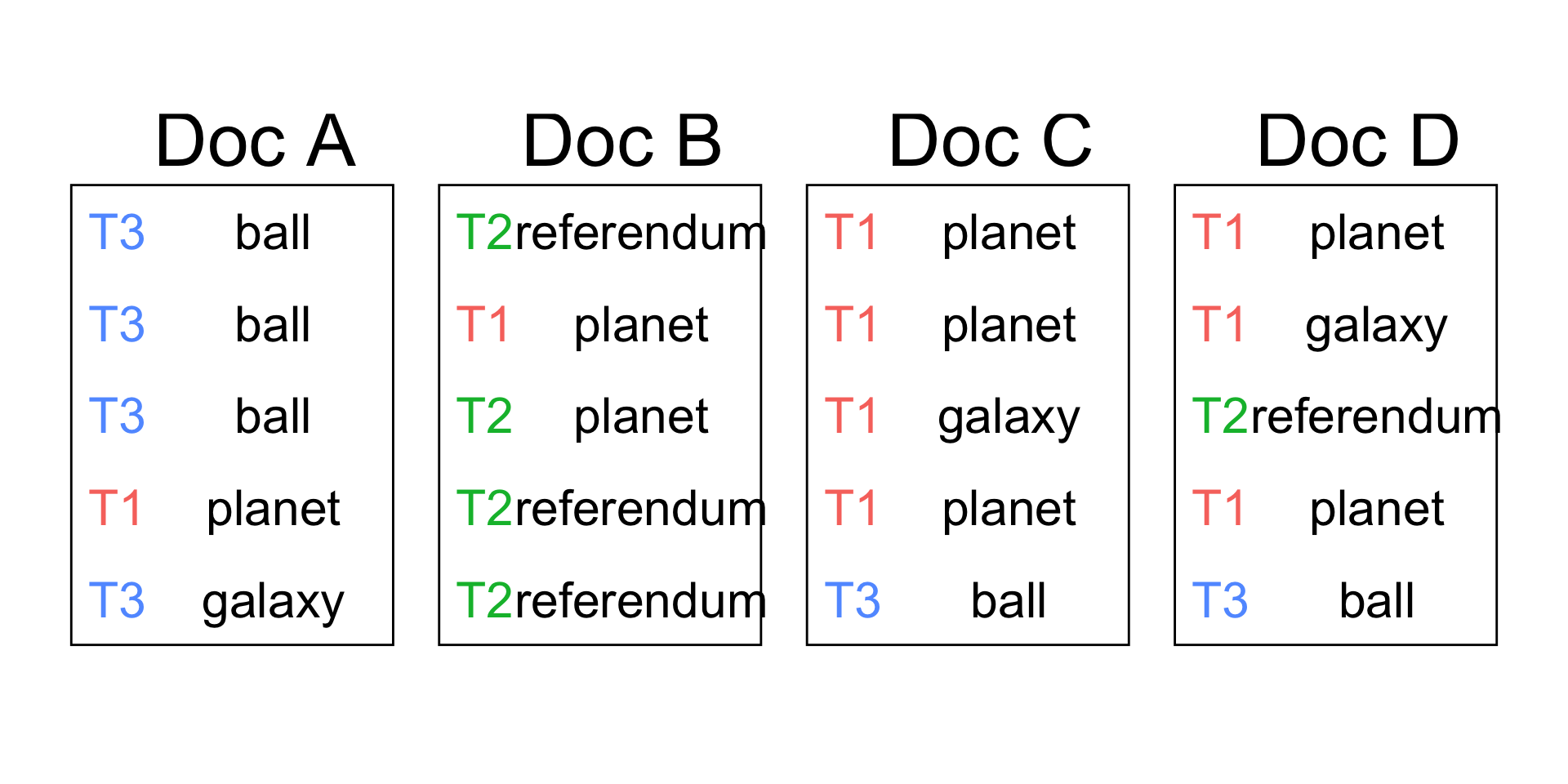 Doc A: how many words in Topic 1 | Doc A: how many words in Topic 2 | Doc A: how many words in Topic 3 |